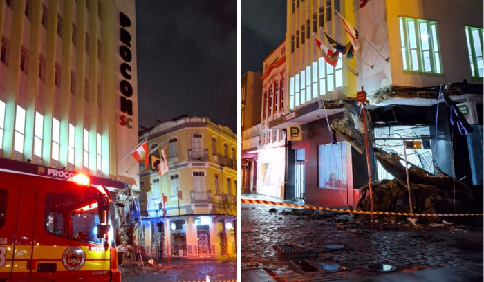 Parte da marquise do prédio do Procon de Santa Catarina desabou na noite deste domingo (18), no Centro de Florianópolis. O incidente ocorreu em uma área de grande circulação de pedestres, mas, apesar do susto, ninguém ficou ferido.